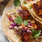 - Assemble the tacos: Remove the cooked fish from the air fryer. Cut it into small, bite-sized pieces, then place into warmed tortillas. Top with a generous portion of cilantro lime slaw. Add an extra squeeze of lime juice over the top for brightness.