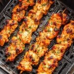 - Air Fry the Skewers: Arrange the chicken skewers in a single layer inside the air fryer basket. Cook for 8 to 10 minutes, flipping halfway through, until the chicken is fully cooked, nicely charred, and no longer pink inside. Ensure the internal temperature reaches 165°F (74°C).