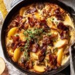 Apple Cider Smothered Chicken is a cozy and flavorful fall-inspired dish featuring tender thin-cut chicken breasts smothered in a rich apple cider and cream sauce, topped with melted Gruyère cheese and crispy prosciutto. Enhanced with fresh herbs, caramelized onions, and sweet Honeycrisp apples, this comforting one-pot meal is perfect for a quick yet impressive dinner.