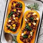 I love how versatile the Apple Sausage Stuffed Butternut Squash Recipe is. Feel free to tweak it based on what you have in your pantry or dietary needs. I actually switch it up depending on the season or what veggies I want to sneak in.