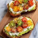 This Avocado Cottage Cheese Toast is a delicious and nutritious twist on the classic avocado toast. Featuring buttery toasted sourdough, creamy high-protein cottage cheese, ripe avocado slices, juicy cherry tomatoes, and flavorful Everything But The Bagel seasoning, this quick and easy recipe makes for a perfect breakfast or snack that balances creaminess, freshness, and a bit of savory crunch.