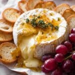 Baked Brie is a simple and elegant appetizer featuring melted brie cheese baked until soft and gooey, then drizzled with honey and topped with fresh thyme. Served with crostini and grapes, this warm, rich dish is perfect for entertaining or a cozy night in.