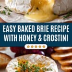 Baked Brie is a simple and elegant appetizer featuring melted brie cheese baked until soft and gooey, then drizzled with honey and topped with fresh thyme. Served with crostini and grapes, this warm, rich dish is perfect for entertaining or a cozy night in.