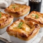 Beef and Stout Pie is a hearty Irish classic featuring tender chunks of chuck steak cooked in a rich stout and beef broth gravy with mushrooms and onions, all encased in a flaky puff pastry crust. This comfort food combines deep, savory flavors with a crispy golden topping, perfect for a satisfying family meal.