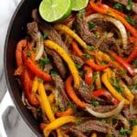 This Steak Fajitas recipe features tender slices of skirt, flank, sirloin, or hanger steak marinated with a flavorful blend of spices and lime juice, then cooked with vibrant bell peppers and onions. Served with warm tortillas and classic condiments like sour cream, guacamole, and salsa, this dish makes a perfect quick and easy meal for any occasion.