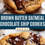 These Brown Butter Oatmeal Chocolate Chip Cookies are delightfully chewy in the center thanks to hearty rolled oats, with crispy golden edges and a rich, nutty flavor from perfectly browned butter. This recipe skips creaming and chilling to make a quick yet decadent batch of soft, buttery cookies studded with chunks of 70% dark chocolate. Perfect for those who crave a classic cookie with a sophisticated twist, these cookies are about 7cm (2.7″) wide and deliciously speckled with chocolate pieces.
