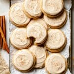 Start by lining a sheet pan with parchment paper — trust me, this step saves you a lot of cleanup and keeps the cookies from sticking. Next, whisk together your gluten free flour (or all purpose), baking soda, baking powder, cinnamon, and salt in a bowl so everything is evenly mixed. Then, in a stand mixer or with a hand mixer, cream together the softened butter, coconut oil, brown sugar, and maple syrup until the mixture is light and fluffy — this usually takes about 3-4 minutes. Add the vanilla, egg, and egg yolk and mix until just combined. Slowly add the dry ingredients, mixing on low until you have a smooth dough. If your dough feels too sticky, chill it for 15 minutes — it helps it hold shape later!