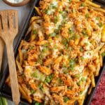 - Assemble and Bake: Once the fries are cooked and crispy, top them evenly with the buffalo chicken mixture and sprinkle the grated Colby cheese over the top. Return the tray to the oven and bake for another 8-10 minutes until the cheese has melted and is bubbly.