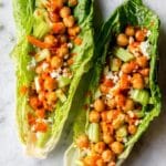 This part is fun and feels special: pile a scoop of the buffalo chickpea mixture on a romaine or bibb lettuce leaf. Then top with that reserved celery and carrot mix, sprinkle blue cheese if you’re using it, and crown it with big celery leaves for color and fresh flavor. Wrap it up like a little package, and dig in! I love this as a casual lunch or light dinner that feels indulgent yet nourishing.