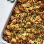 - Optional make-ahead and reheating: This stuffing can be made a day ahead and refrigerated. Remove it from the fridge 60 minutes before reheating to come to room temperature. Reheat in the oven until warmed through. It also works well as a bird stuffing.