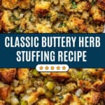 Our Favorite Buttery Herb Stuffing is a classic and comforting dish featuring toasted bread cubes blended with sautéed onions, celery, garlic, and fresh aromatic herbs like sage, parsley, and rosemary. Enriched with butter, chicken or vegetable stock, and eggs, this stuffing delivers moist, flavorful texture perfect for holiday dinners, served as a side or inside a roasted bird.