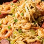 - Finish with shrimp and sausage: About 1 minute before the pasta is fully al dente, stir in the cooked shrimp and sausage. Turn off the heat and add sliced green onions.
