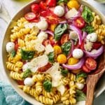 I don’t recommend freezing this pasta salad because the fresh basil, tomatoes, and mozzarella don’t hold up well to freezing and thawing—they tend to get watery and lose their texture. It’s best enjoyed fresh or chilled.