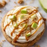 - Assemble the Cookies: Once the cookies are fully cooled, spread a generous layer of the caramel cream cheese frosting on each cookie. Sprinkle the streusel mixture on top, then add the cubed green apple evenly over the cookies. Drizzle with additional caramel sauce to finish.
