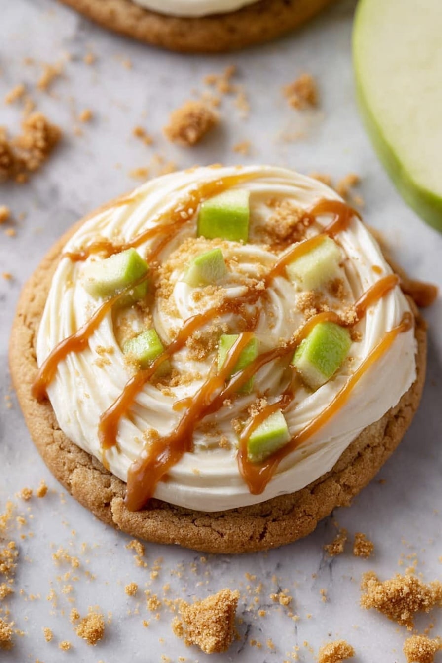 - Assemble the Cookies: Once the cookies are fully cooled, spread a generous layer of the caramel cream cheese frosting on each cookie. Sprinkle the streusel mixture on top, then add the cubed green apple evenly over the cookies. Drizzle with additional caramel sauce to finish.