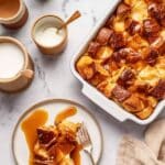 - Serve: Once baked, cut the bread pudding into slices and serve warm, generously drizzled with the homemade caramel sauce for an indulgent finish.