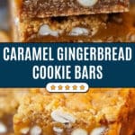 Delight in these indulgent Caramel Gingerbread Cookie Bars featuring a soft gingerbread cookie filled with gooey caramel and bursts of white chocolate chips, perfectly spiced for a festive treat.