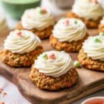 Deliciously moist and chewy carrot cake cookies topped with a creamy vanilla-flavored cream cheese frosting. These cookies combine the warm spices and shredded carrots of classic carrot cake with hearty oats and nuts for added texture and flavor. Perfect for a delightful dessert or snack that’s easier and quicker than traditional carrot cake.