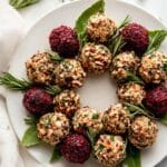 This delightful Cheese Ball Wreath is a festive and delicious appetizer perfect for holiday gatherings. Made with a creamy blend of cream cheese, shredded cheddar, and savory seasonings, these miniature cheese balls are rolled in colorful toppings like dried cranberries, chopped nuts, and fresh herbs. Arranged in a wreath shape and garnished with fresh herbs, they’re both visually stunning and irresistibly tasty, making them the ideal addition to your Christmas appetizer spread.