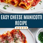 A comforting and delicious Cheese Manicotti recipe featuring uncooked manicotti shells filled with a creamy mixture of ricotta, mozzarella, and parmesan cheeses, baked in rich marinara sauce for a hearty family meal.