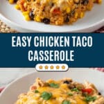 This Chicken Taco Casserole is a delicious, creamy, and flavorful meal perfect for busy weeknights or game day. Made with shredded chicken, black beans, corn, diced tomatoes with green chilies, taco seasoning, sour cream, and melty Colby Jack cheese, it’s a comforting dish that comes together quickly and bakes to cheesy perfection with a crunchy tortilla chip topping.