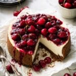 This Cherry Cheesecake recipe features a rich, creamy vanilla cheesecake baked on a buttery biscoff cookie crust and topped with a luscious homemade sweet cherry pie topping. Perfect for special occasions or a delightful dessert treat, this cheesecake combines smooth textures with vibrant cherry flavors for an irresistible experience.