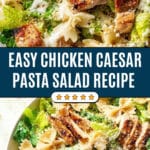 A vibrant and satisfying Chicken Caesar Pasta Salad combining tender sautéed chicken breasts, al dente farfalle pasta, crisp Romaine lettuce, creamy Caesar dressing, and flavorful garlicky breadcrumbs topped with Parmesan cheese. Perfect for a quick lunch or light dinner, served immediately or chilled.