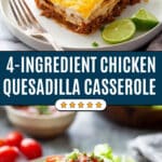 This 4-Ingredient Chicken Quesadilla Casserole is a quick, easy, and delicious dinner perfect for busy weeknights. Made with shredded chicken, salsa, cheese, and flour tortillas, it layers these simple ingredients into a hearty casserole that’s cheesy, flavorful, and sure to satisfy the whole family. You can customize it with your favorite garnishes like avocado, sour cream, or fresh cilantro for a fresh finish.