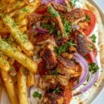 A flavorful and easy-to-make Chicken Shawarma with Garlic Yoghurt Sauce recipe featuring marinated chicken thighs cooked to perfection, served with crispy fries, fresh vegetables, and a garlicky yoghurt sauce in warm flatbreads or wraps. Perfect for a satisfying weeknight meal with customizable toppings.