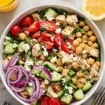 A vibrant and fresh Chickpea Tuna Salad combining protein-packed chickpeas and albacore tuna with crisp vegetables, tangy feta, and a zesty lemon-garlic dressing. Perfect for a healthy, quick, and flavorful meal.