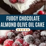 This fudgy Chocolate Almond Olive Oil Cake is a rich, dairy-free dessert perfect for the holiday season. Featuring a moist chocolate-almond base made with olive oil and almond flour, it is topped with a fluffy coconut milk frosting and garnished with spiced sugared cranberries for a festive touch. Soy-free and full of delightful textures and flavors, this cake is both indulgent and allergen-friendly.