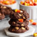 I usually keep garnishes simple with these cookies – a light sprinkle of flaky sea salt on top right before baking adds a beautiful contrast to the sweet candy corn and chocolate. For a festive touch, you can also dust with a little cocoa powder or chopped nuts after baking. It’s subtle but adds a nice visual and flavor boost.