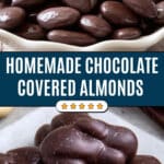 Delicious homemade chocolate covered almonds made with roasted whole almonds coated in smooth melted dark, milk, or a combination of chocolates. Perfect as a snack or a thoughtful gift, these treats are simple to make and irresistibly satisfying.