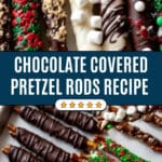 Delicious and easy-to-make Chocolate Covered Pretzel Rods combine salty pretzels dipped in rich, melted chocolate and decorated with your favorite toppings. Perfect for holidays, parties, or a sweet snack, these treats are fun for kids and customizable to suit any occasion.