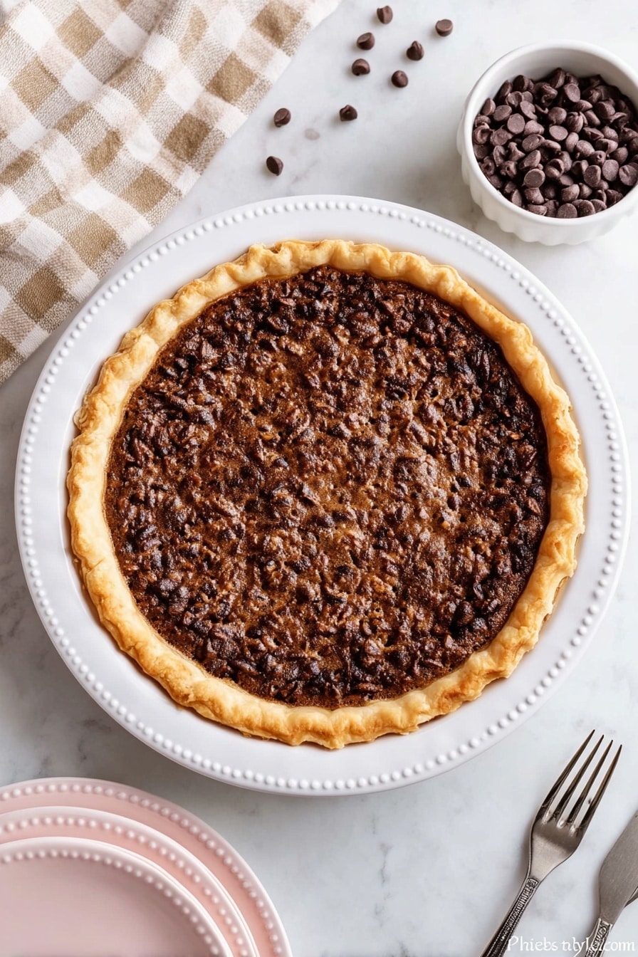 Pour the chocolate-pecan filling slowly over the pecans in the crust, making sure the nuts get fully submerged. Bake on the center rack for about 45-55 minutes. Around the 30-minute mark, check if the crust edges are browning too quickly—I learned the hard way that use of foil crust protectors is a game changer to avoid burnt crust. If the top looks like it’s getting too dark towards the end, tent a piece of foil over the whole pie to protect it.