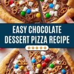 A fun and delicious dessert pizza featuring a crispy pizza dough base topped with creamy Nutella, mini marshmallows, colorful M&M’s, and crunchy pretzels. Perfect for a sweet treat or party dessert that combines chocolatey goodness with a satisfying crunch.
