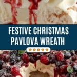 For extra festive flair, I’ve presented this pavlova on a wooden board surrounded by holly sprigs or pine branches—instantly brings Christmas vibes to your table. You can also pipe the whipped cream into decorative rosettes around the wreath edge for a fancy look. If you’re short on time, making mini pavlova wreaths on a baking sheet is a fun idea and perfect for individual servings at parties.