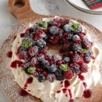 A festive Christmas Pavlova Wreath featuring a crisp meringue base topped with luscious whipped cream, a vibrant mix of fresh berries, freeze-dried raspberries, and a drizzle of raspberry coulis, garnished with mint leaves for a refreshing touch. Perfect for holiday gatherings and celebrations.