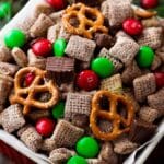 This reindeer chow is a great standalone snack, but if I’m pairing it, I like warm cocoa, eggnog, or even a fresh fruit platter to balance all the sweetness. It makes for a fun holiday snack spread everyone loves grazing on!