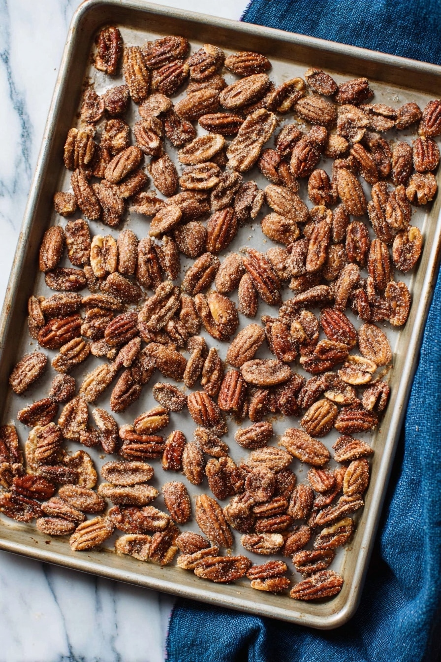 Spread your coated pecans evenly on the prepared pan. Bake for 1 hour, stirring every 15 minutes to make sure they toast uniformly and avoid burning. Keep an eye on them during the last batch of stirring—they should feel dry to the touch and have a beautiful golden-brown color.