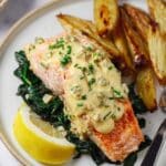 - Garnish and serve: Sprinkle the baked salmon with additional chopped parsley or thinly sliced chives. Serve immediately with fresh lemon wedges. Enjoy on its own or pair with lemon beurre blanc sauce and your favorite side dishes.