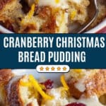 This Cranberry Christmas Bread Pudding is a rich and festive holiday dessert featuring dried bread cubes soaked in a creamy mixture of condensed milk, milk, eggs, cinnamon, and vanilla. Enhanced with toffee bits, dried cranberries, and a hint of orange zest, it is baked to golden perfection and served warm, optionally topped with caramel sundae sauce and whipped cream for an indulgent finish.