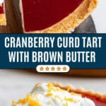 This Cranberry Curd Tart features a rich and crumbly brown butter shortbread crust filled with a tangy and luscious cranberry curd. Topped with freshly whipped cream and a hint of orange zest, this festive dessert is the perfect holiday treat that balances sweet, tart, and creamy flavors beautifully.