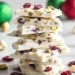This Cranberry Pistachio White Chocolate Bark is a quick and easy no-bake holiday treat combining the tartness of dried cranberries, the buttery crunch of salted pistachios, and the creamy sweetness of melted white chocolate. Perfect for gifting or enjoying as a festive snack.