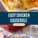 This comforting Chicken Casserole recipe combines tender shredded chicken with a creamy mixture of condensed soup, sour cream, and spices, topped with crunchy buttery Ritz crackers and melted cheddar cheese. Baked to golden perfection, it makes a delicious and easy dinner perfect for family meals or gatherings.