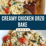 This Chicken Orzo Bake is a creamy, cheesy, and savory Tuscan-inspired casserole that’s perfect for a comforting family meal. Featuring tender chicken, orzo pasta, fresh spinach, and juicy tomatoes baked in a luscious sauce with mozzarella and parmesan cheeses, it’s easy to prepare, satisfying, and great for meal planning with delicious leftovers.