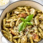 A creamy, flavorful Chicken Pesto Pasta featuring tender Italian-seasoned chicken, perfectly cooked penne, sun dried tomatoes, and rich basil pesto blended with parmesan and heavy cream for a quick and satisfying meal.