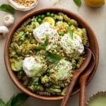 Creamy Green Goddess Pasta Salad combines tender pasta tossed in a vibrant, herb-packed Greek yogurt and mayonnaise dressing with crisp sautéed zucchini, asparagus, and peas. Finished with fresh lemon zest, pine nuts, and creamy burrata, this refreshing pasta salad is perfect for summer gatherings, potlucks, or light meals.