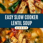 Hearty and nutritious slow cooker lentil soup loaded with vegetables, red lentils, and topped with creamy cheddar cheese and crispy homemade tortilla strips for a delightful crunch.
