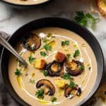This creamy Mushroom Soup is rich, comforting, and packed with intense mushroom flavor. Made by sautéing a combination of white and brown mushrooms with onions and garlic, then simmered in vegetable stock and finished with crème fraiche, this soup is blended to a smooth consistency for a velvety texture. Garnished with croutons, fresh herbs, and a drizzle of cream or olive oil, it’s perfect for a cozy meal and served with crusty bread for dipping.